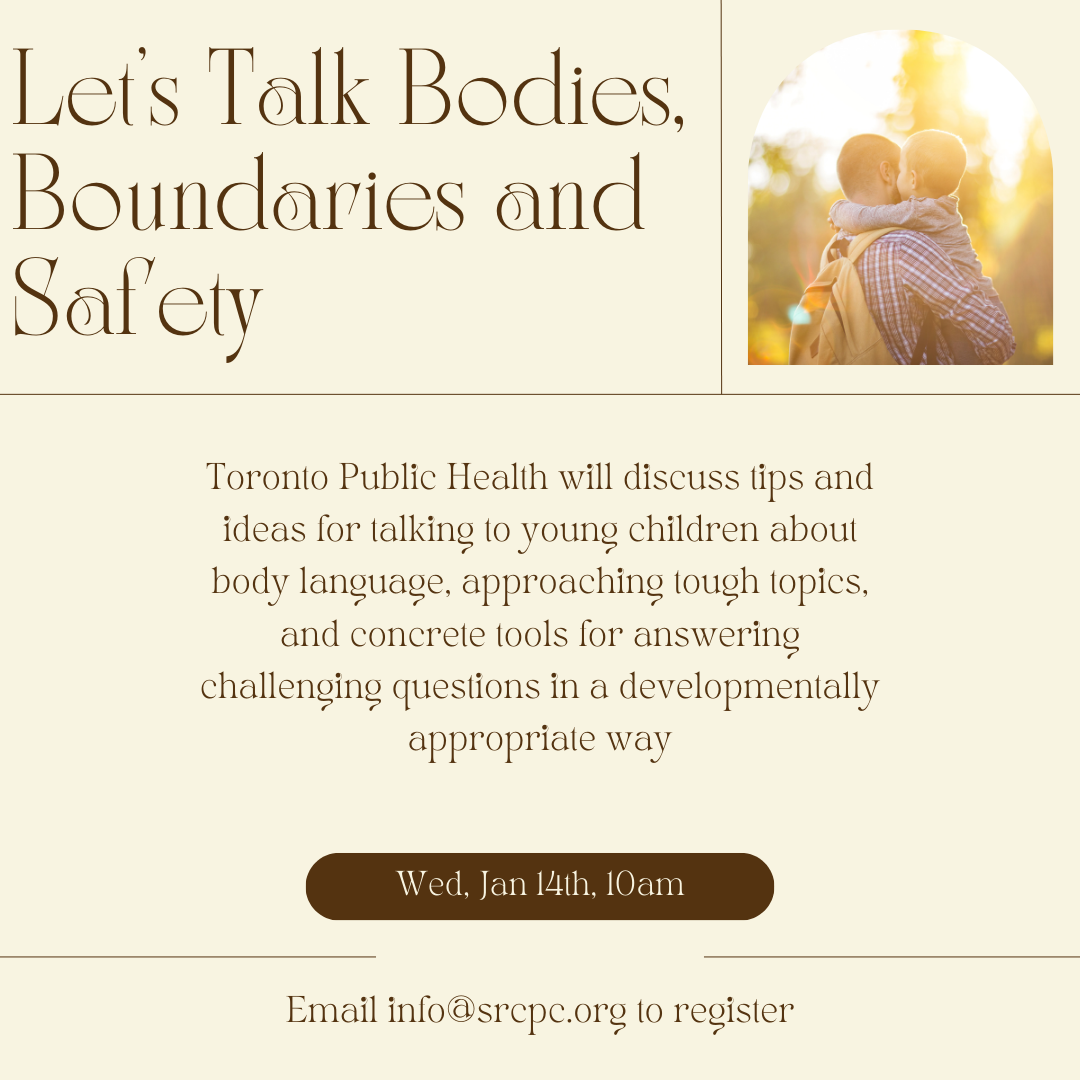 Join Toronto Public Health to discuss tips and ideas for talking to young children about body language, approaching tough topics, and concrete tools for answering challenging questions in a developmentally appropriate way. Resources will be shared and discussed during the workshop.