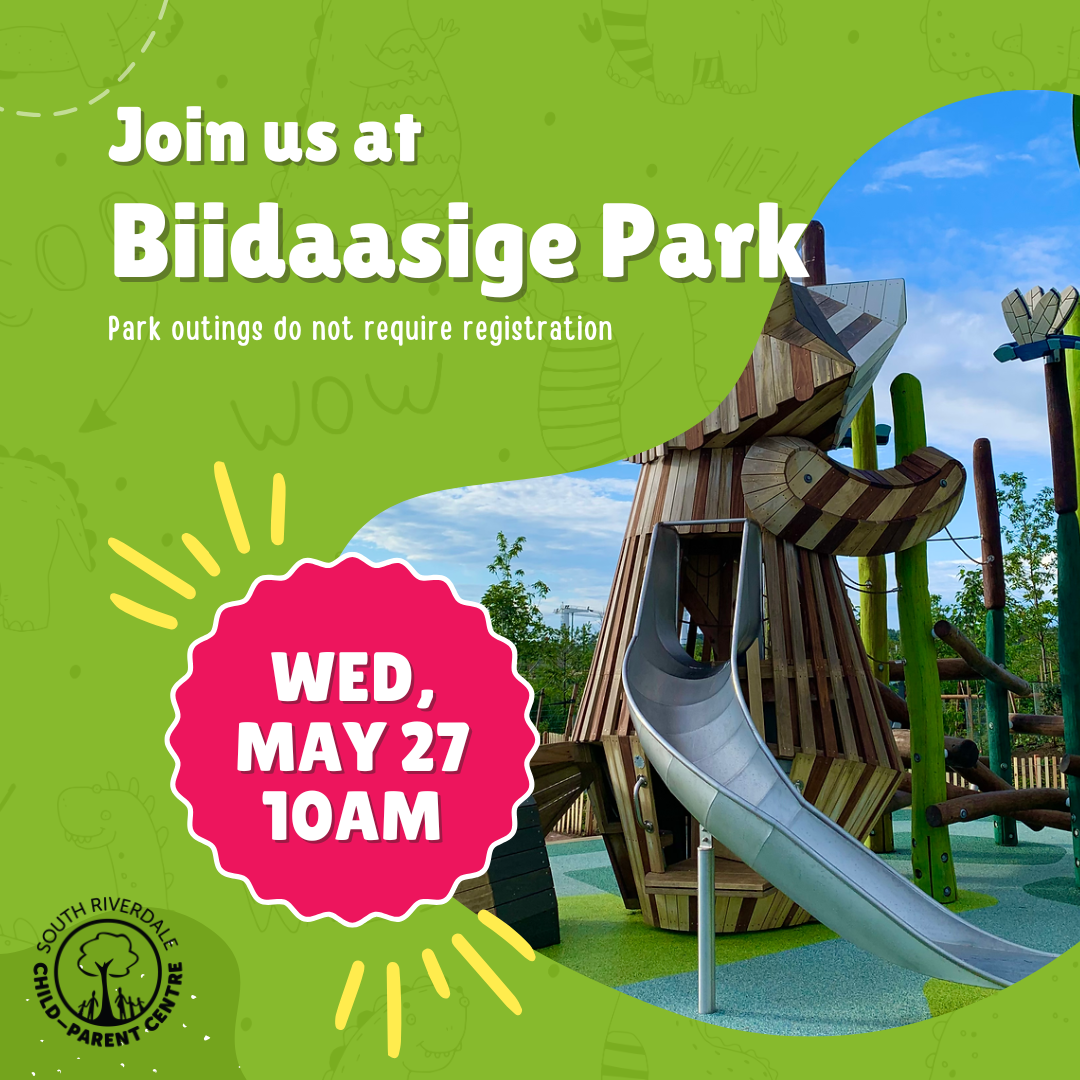 We’re taking a trip to the new Biidaasige “bee-daw-si-geh” Park located at 51 Commissioners St. We’ll ex-plore the Snowy Owl Theatre, the Badlands Scramble, the Dodem Animal Sculptures, and the cableway! Please dress for the weather and bring water.