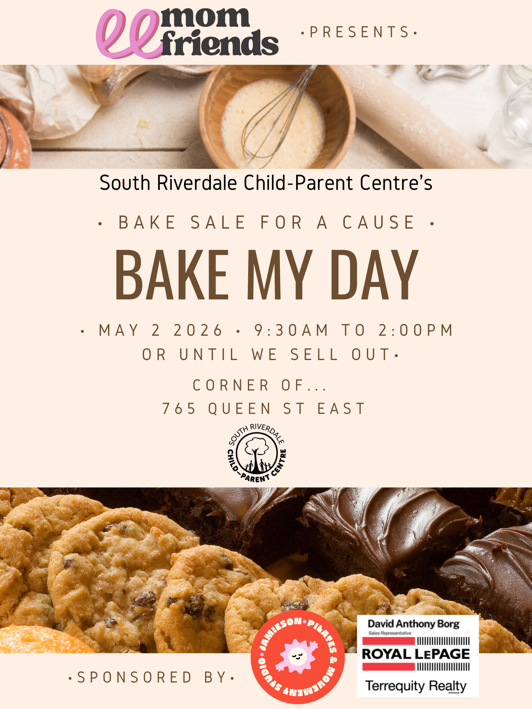Join us for Bake My Day, South Riverdale Child-Parent Centre’s annual bake sale fundraiser on May 2nd from 9:30am–2:00pm (or until we sell out!) at the corner of 765 Queen St East.
